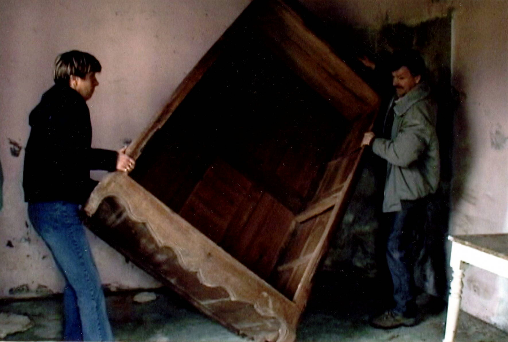 Dans La disparition, un engin mécanique de gros oeuvre s’agite dans le cadre. Une famille, homme, femmes et enfant patiente dans la seule pièce d’une minuscule maison à l’abandon. Dans cette salle d’attente domestique, ils se scrutent les un·es les autres, guettent l’engin démolisseur qui orchestre, déplace les deux meubles restants comme pour occuper leur temps même absurde. La tractopelle menace. L’armoire est un objet moulo qu’on se doit de manipuler après précautions sous peine de récolter les foudres du défunt voire du destin.