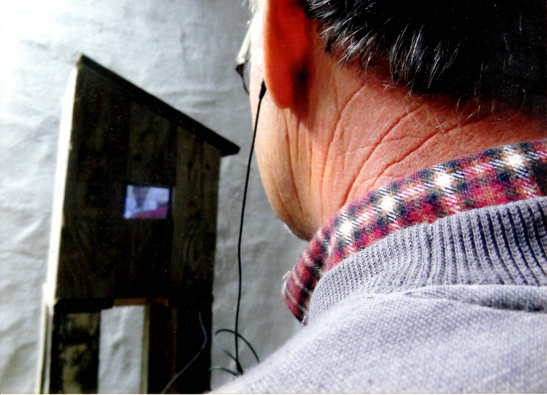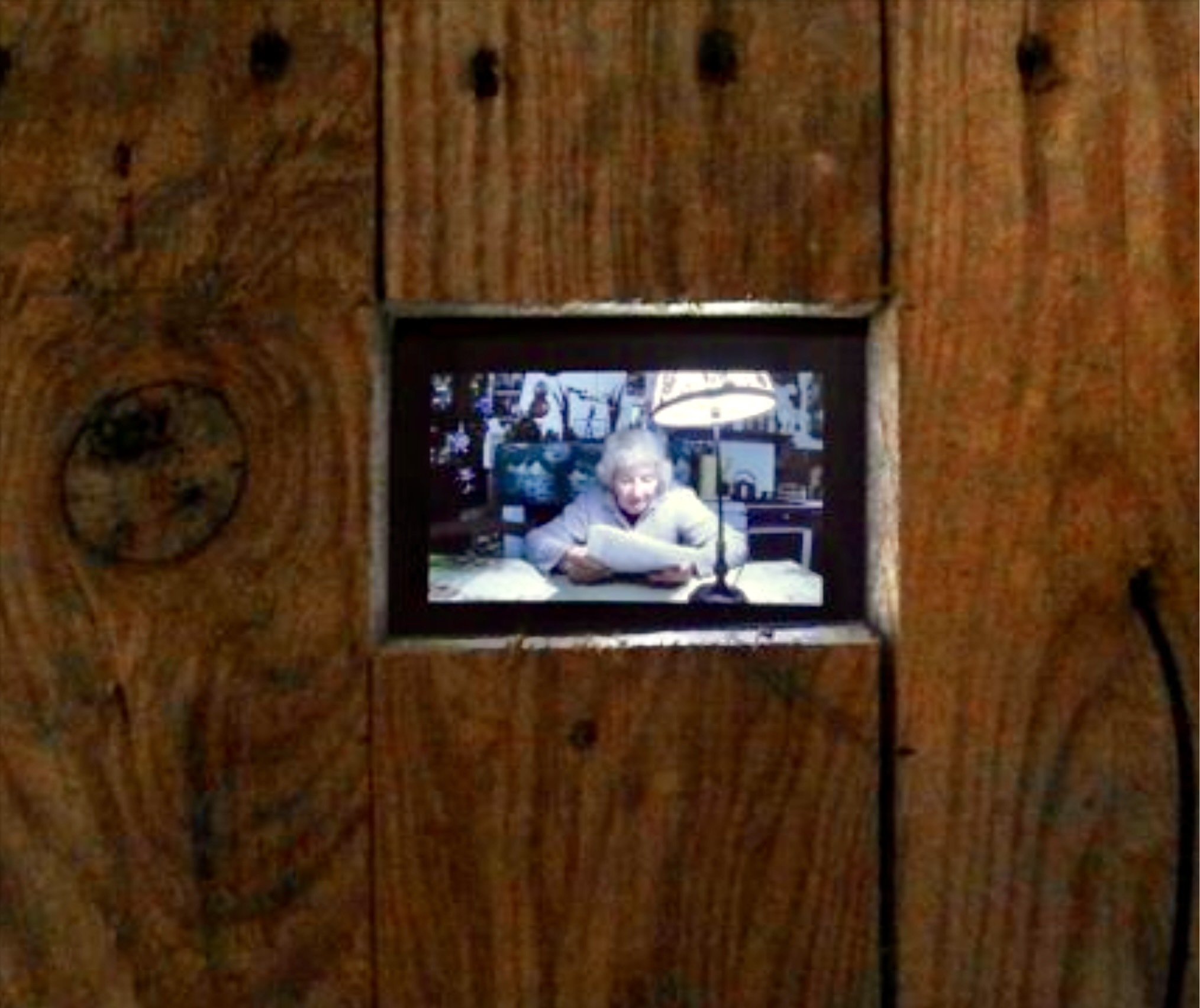 « Mémémoires de famille » est une construction en bois de palettes : celles que ma grand-mère utilise pour chauffer sa maison. Elle représente une cabane perchée dont la seule ouverture accueille une vidéo. On peut y voir Léna attablée, derrière elle son feu de cheminée. Elle est la diseuse et dira « douleur » pour « doubleur ». Elle n’a pas l’habitude de lire ces mots : les miens et ceux d’un certain art contemporain dont elle est pourtant l’interprète, la maîtresse ignorante.