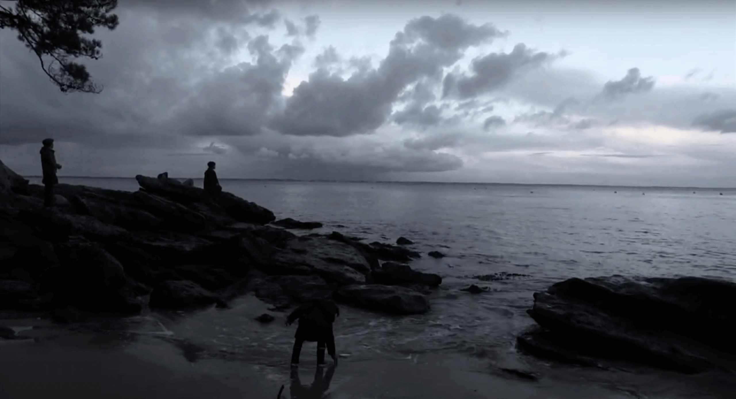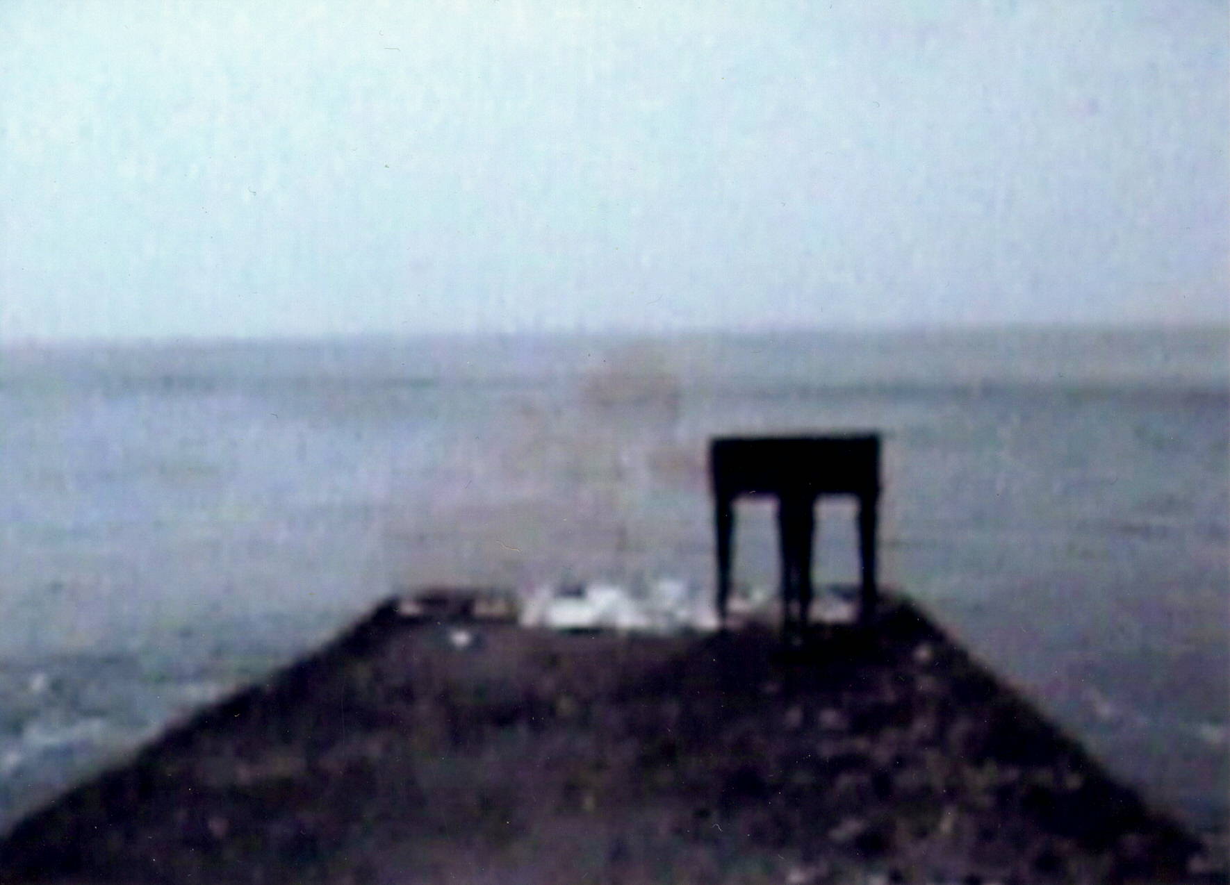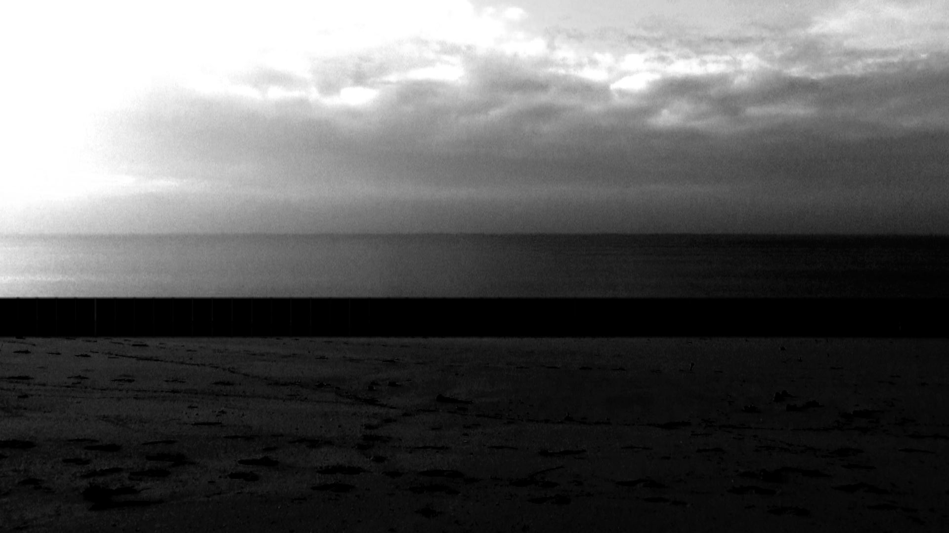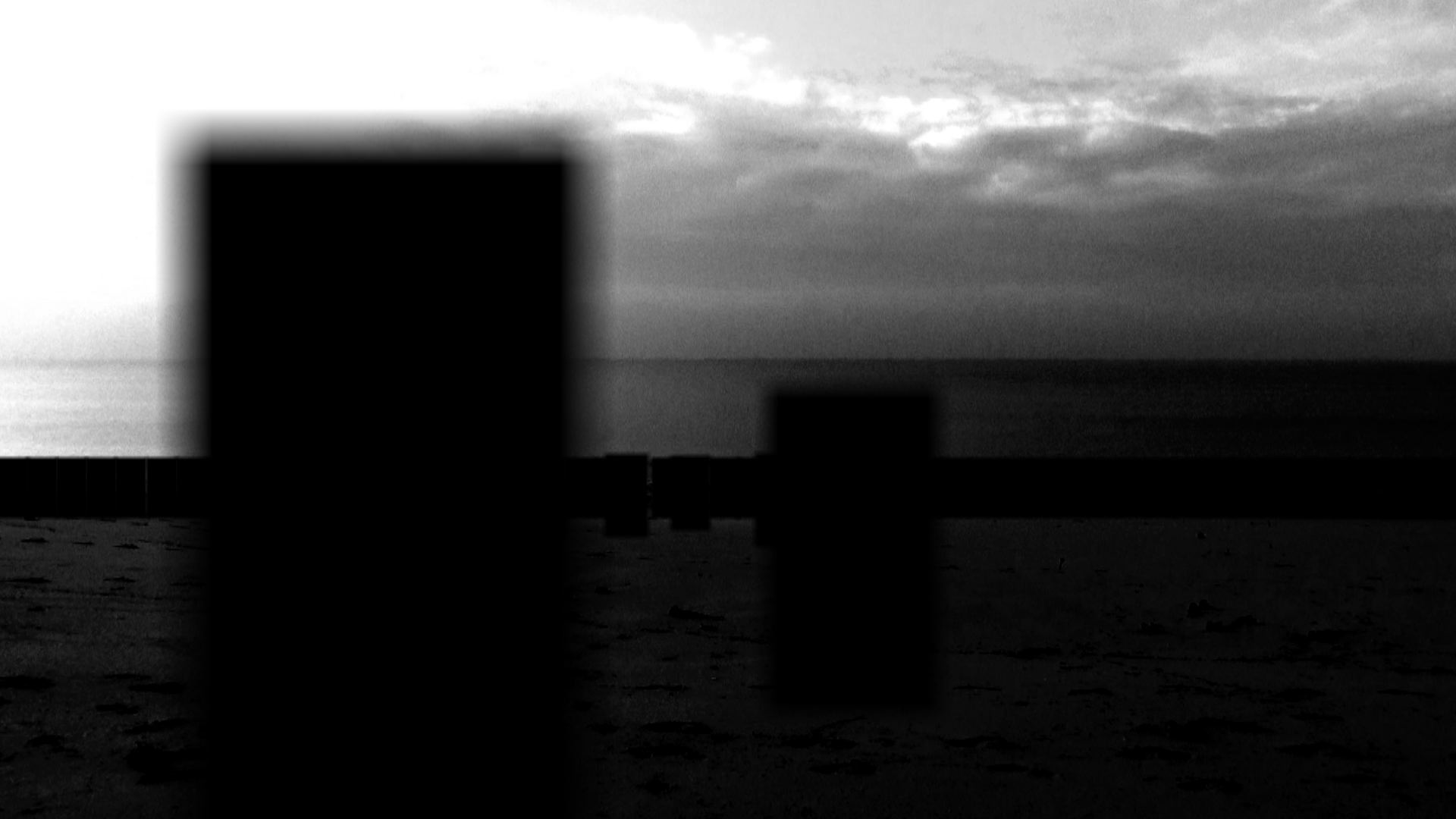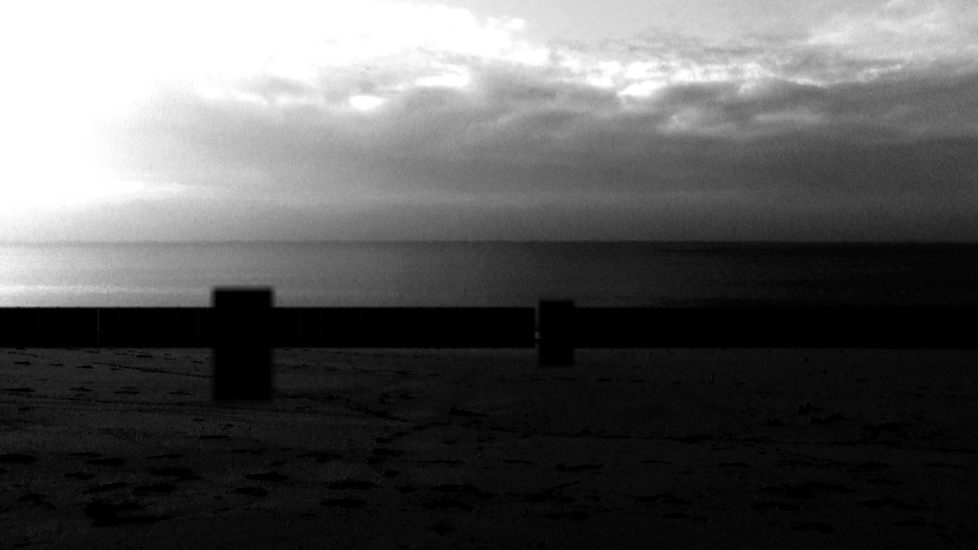 Ce qu’il y a à voir, rien sinon le tremblement du noir sur l’écran. En fond sonore, le bruit des vagues. Ça marche ? C’est alors que « ça » apparaît et se met à bouger. « Ça » est ce même écran noir retourné, redressé qui soudain se déplace, s’éloigne de nous par à coups, et se démultiplie comme cela se fait dans le monde des images. Ils vont donc, jouent en coexistence et dans un système perceptif classique (le rapport distance/dimension), s’enfoncent dans la profondeur de l’image, se rapetissent nous laissant découvrir un paysage dans lequel ils évoluent : une vue de l’Océan Atlantique.
