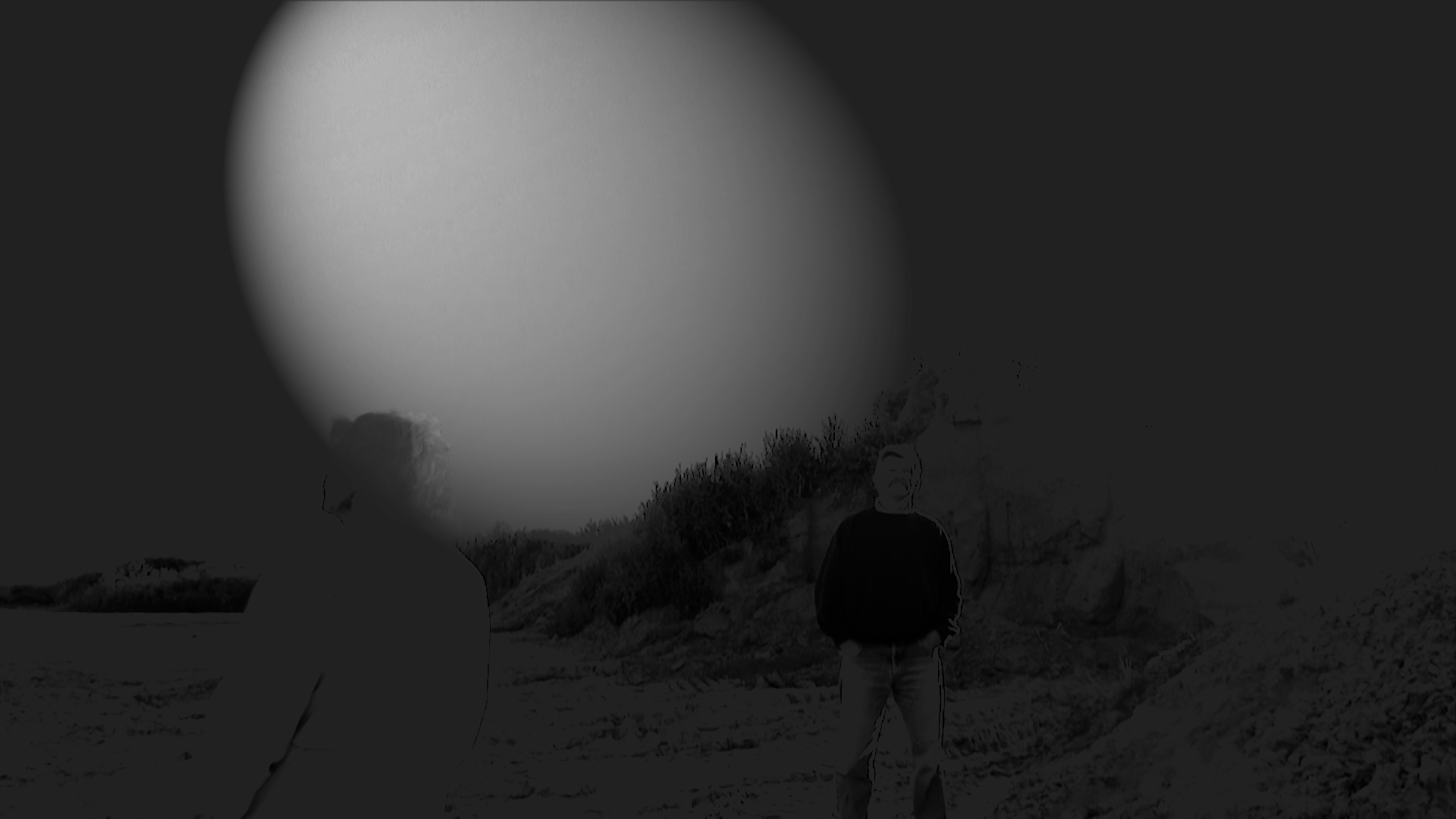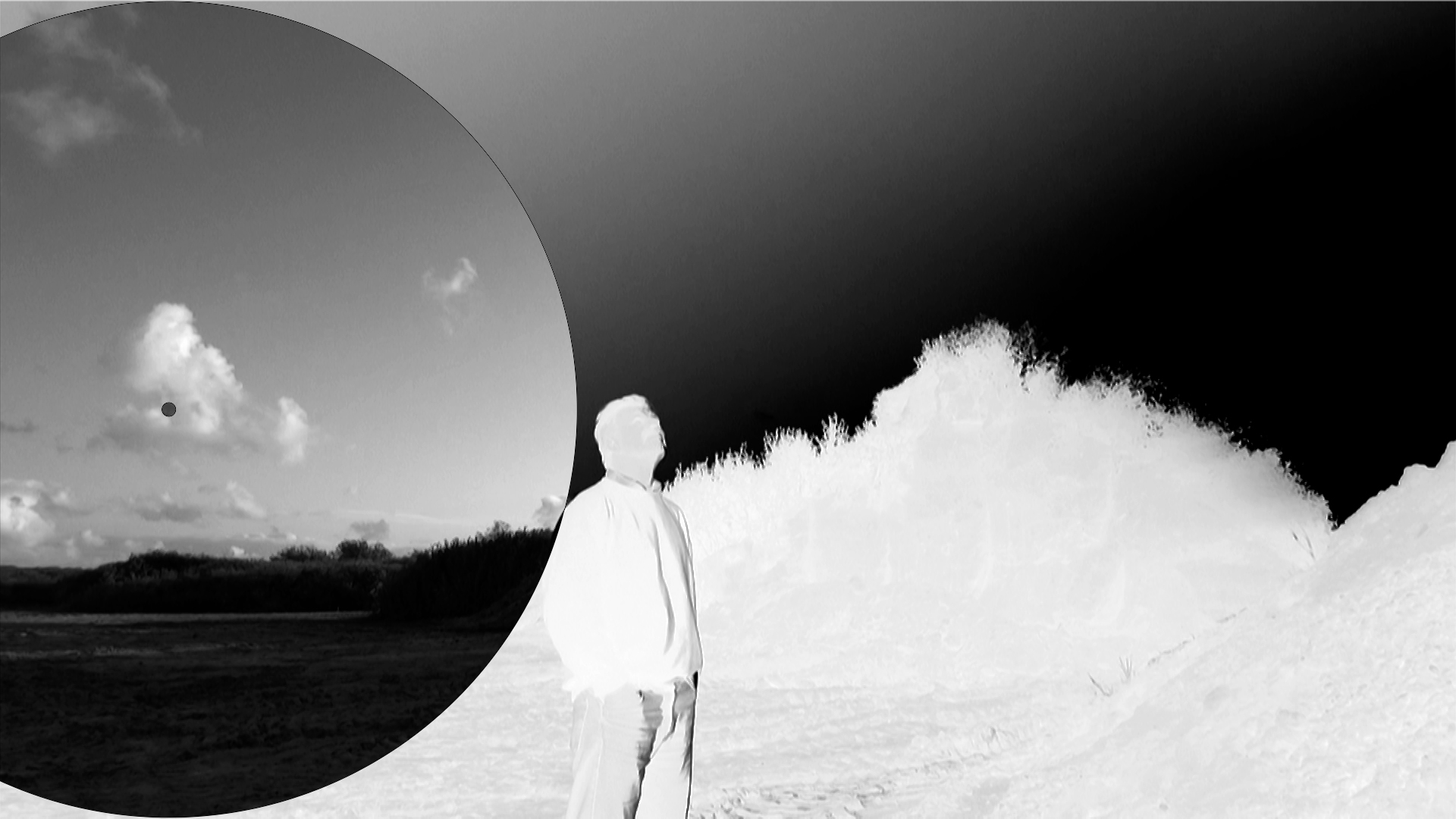 Deux figures fantomatiques habitent un paysage surnaturel. On ne saurait les situer. On ne saurait dire : « Où est quand ». Ce qui est de l’ordre de la fiction et ce qui est de l’ordre d’un réel révélé dans sa théâtralité s’y côtoient, s’y confondent.